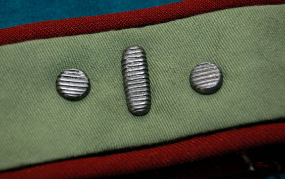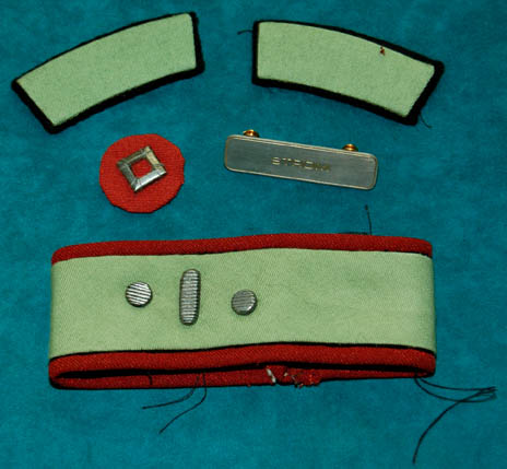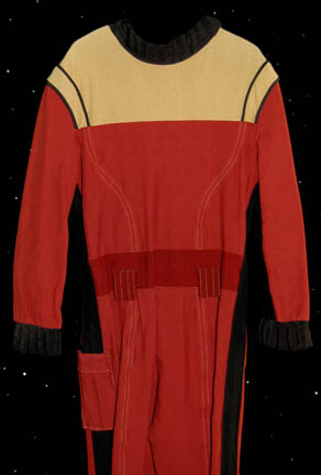 Description: A Starfleet uniform jumpsuit of the style appearing first in Star Trek II: The Wrath of Khan and continuing service through at least Star Trek VI: The Undiscovered Country. The costume is red with black lining and tan colored shoulders and chest. The black ribbed collar and cuffs indicate the wearer to be a crewman. These unattached elements accompany the uniform, a pin backed metallic silver name badge reading ‘STROM' in etched lettering, a red rank placement with an attached metallic silver badge indicating the wearer to be an ‘able seaman’, a red bordered green division strip for the left sleeve with two attached silver colored metal ‘5 year service’ pins and a commendation bar, and a pair of unattached green division strips for the shoulders indicating the wearer to be a member of the medical division.