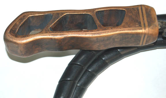 Description: A prop weapon featured in the Star Trek: Enterprise episode “Acquisition”; which gives us our “first” unofficial introduction to the Ferengi where a group of them incapacitate the crew of the “Enterprise NX-01” and begin to raid it before they realize that one member of the crew is not unconscious because he was in decontamination. This item is a prop whip featuring a cord core and coiled plastic completely encircling it, a leather strap to attach it to your belt, and a brown resin, molded, handle with gold-colored stripes, and finger holes for added leverage. The item measures approx. 71 X 1.5 inches.