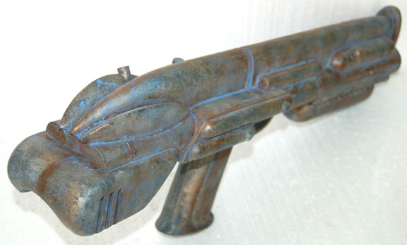 Description: A cast rubber hand carbine painted to match the aged style of the “Alien Mine Guards” from the episode “The Xindi” of Star Trek: Enterprise. Vaguely shotgun in appearance they feature a handgrip with trigger and guard, another grip under the barrel affixed to a housing for a flashlight (as was evident in the episode), and when held aloft there is a cut out for the wrist. It measures approx. 20 X 6.5 X 4 inches.