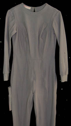 Description: A gray colored Class-D Starfleet Uniform jumpsuit featured in Star Trek I: The Motion Picture. The costume features an open topped pocket on the right thigh, an unattached plastic bio-monitor, a pair of sciences orange division strips for the shoulders, and an orange backed Epsilon IX assignment patch for the left breast. The costume is intended for female wearers.