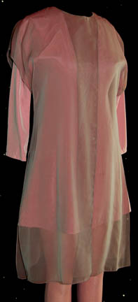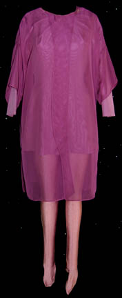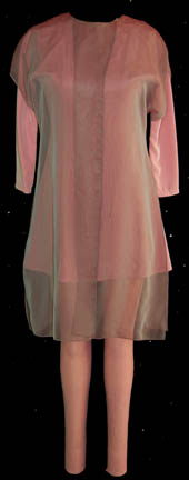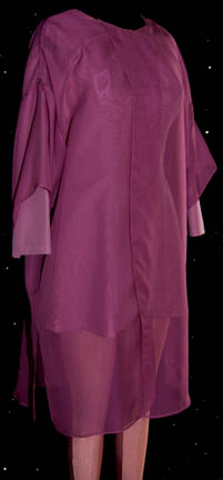 Description: A lot of costumes featured in the Star Trek: Voyager episode “Virtuoso”; wherein the “Voyager” crew assists an alien race who never evolved music so that when they hear “The Doctor” (Robert Picardo) singing while he treats them, he becomes an instant celebrity. This lot includes two costumes: the first is a long-sleeved, pink shirt in a slightly reflective material, singular, vertical stripes down both sides, matching leggings, and a short-sleeved, sheer, overall gray shirt that changes colors depending on what angle you are looking at it. The second costume is a sleeveless, full-length, lilac-colored jumpsuit in a silk-like fabric, attached feet, lighter colored stitching around the collar and cuffs; a purple, long-sleeved, dress, and a long-sleeved, sheer, dark purple shirt. A sewn in tag in the first reads merely ‘Lan Pho' and the second reads ‘Voyager, Athena McDaniel’.