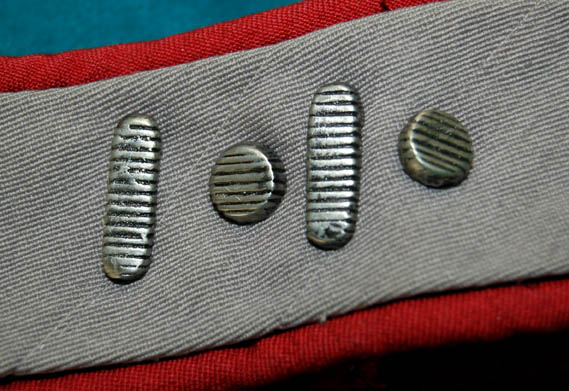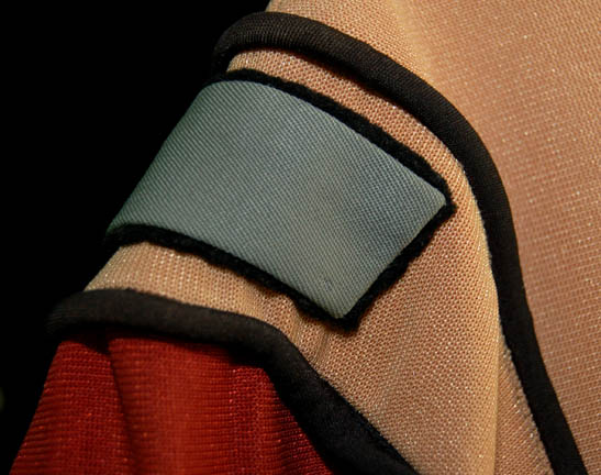 Description: A Starfleet uniform jumpsuit of the style appearing first in Star Trek II: The Wrath of Khan and continuing service through at least Star Trek VI: The Undiscovered Country. The costume is red with black lining and tan colored shoulders and chest. The black ribbed collar and cuffs indicate the wearer to be a crewman and the gray shoulder mounted division strips indicate the wearer to be sciences division. These unattached elements accompany the uniform, a pin backed metallic silver name badge reading ‘FAMBI' in etched lettering, a red rank placement with an unattached metallic silver and gold badge indicating the wearer to be a ‘master chief petty officer’, and a red bordered gray division strip for the left sleeve with two attached silver colored metal commendation bars and two ‘5 year service’ pins.