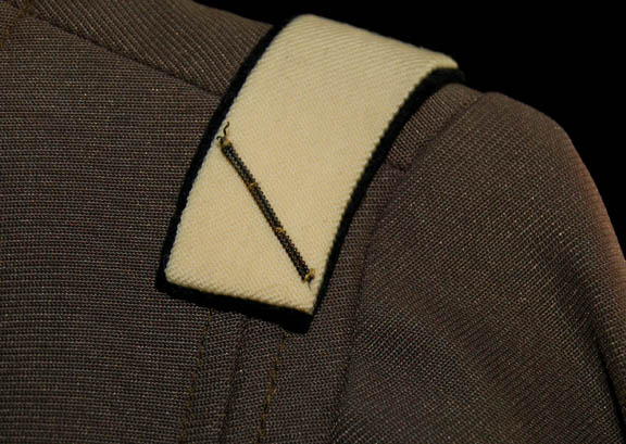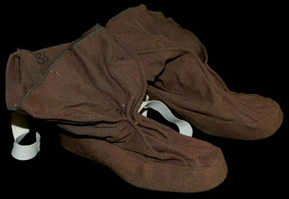 Description: A dark gray Class-D Starfleet uniform jumpsuit featured in Star Trek I: The Motion Picture. The costume comes with matching unattached cloth covered shoes, attached command white division-rank strips with thing gold thread embroidery, an attached plastic bio-monitor, and an unattached white backed Epsilon IX assignment patch. The rank lines on the division strips have been speculated to equivocate the rank of ‘crewman second class'. The costume is intended for female wearers. A costumer’s tag reads ‘Star Base Personnel’.