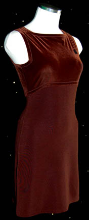 Description: A costume similar to those featured in various episodes of Star Trek: Voyager for wear by Roxann Dawson in the role of the half-Klingon, ex-Maquis, Chief Engineer of the Starship “Voyager”, “Lieutenant B'Elanna Torres”, and is a sleeveless, brown, velveteen dress featuring an empire waist, beneath which the dress is a lycra fabric with slits up either side, a Velcro patch for a commbadge (not included), and is believed to be a dress worn on a date with “Tom Paris” (Robert Duncan McNeill) before they got married. A sewn in tag reads ‘Voyager, Roxann Dawson’.
