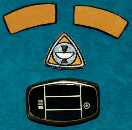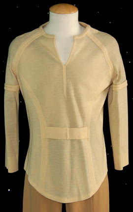 Description: A tan Class-B long sleeved top with khaki trousers featured in Star Trek I: The Motion Picture. The lot comes with an unattached plastic bio-monitor, a pair of operations yellow colored division strips for the shoulders, and a yellow backed Epsilon IX assignment patch for the left breast. The costume is intended for male wearers.