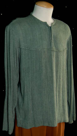 Description: A costume featured in the Star Trek: Enterprise episode “Twilight”; wherein the anomalies in the expanse have affected “Captain Archer's” (Scott Bakula) brain in such a way that he cannot form long-term memories and he wakes up one day to realize twelve years has passed and Earth has been destroyed. This costume is for wear by Scott Bakula in the role of the captain of the “Enterprise NX-01”, “Jonathan Archer”, and is a long-sleeved, light green shirt featuring a zip under the collar, a raised, horizontal stripe that goes all the way around the garment, clay-colored trousers with elastic and tie at the waist, functional pockets and is slightly faded for effect. A sewn in tag reads ‘Enterprise, Scott Bakula’.