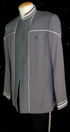 Description: A Starfleet uniform unlike any other, a dress uniform made for band members at formal functions, in so saying it appeared at the wedding of “Commander Riker” (Jonathan Frakes) and “Councilor Troi” (Mirina Sirtis) in Star Trek X: Nemesis. This costume consists of black trousers with a gray Starfleet dress uniform jacket with white piping and quilted gray bands running down the zip front. The left breast features a sewn on gray Velcro placement and the lot is intended for male wearers.