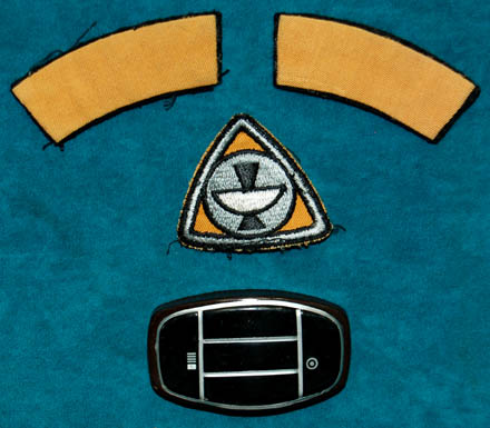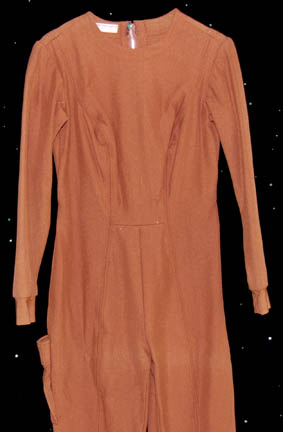 Description: A brown colored Class-D Starfleet Uniform jumpsuit featured in Star Trek I: The Motion Picture. The costume features an open topped pocket on the right thigh, an unattached plastic bio-monitor, a pair of operations yellow division strips for the shoulders, and a yellow backed Epsilon IX assignment patch for the left breast. The costume is intended for female wearers.