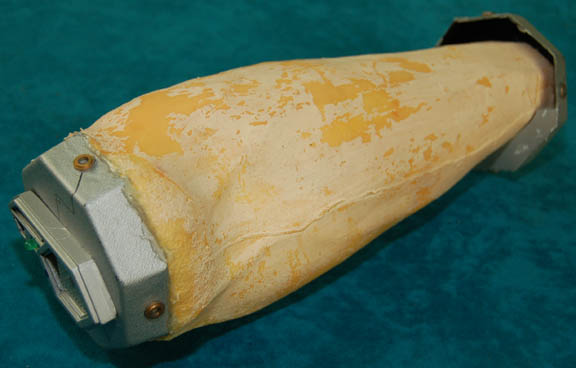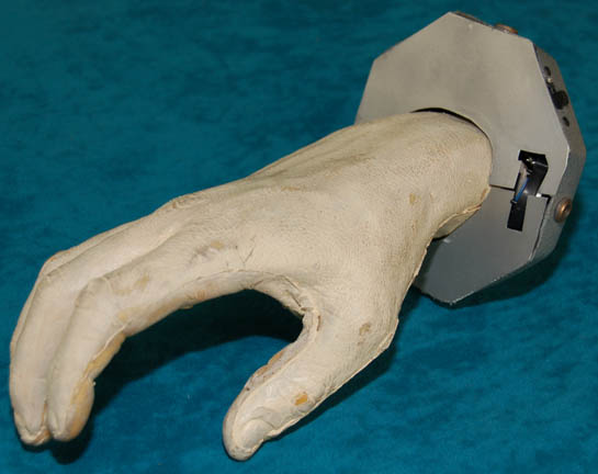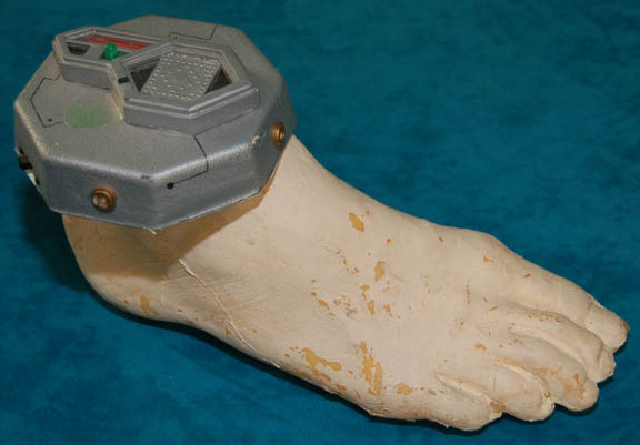 Description: “Dr. Soong” (Brent Spiner) was a cyberneticist who created the Soong-type androids including “Data” (Brent Spiner) and “Lore” (Brent Spiner). These are Soong-type android parts made for use during the filming of Star Trek episodic television. The lot includes two cast foam lower legs, one foot and one hand. Each is painted to appear like android “Skin” however due to time and use the paint is flaking off. At each end of the limbs and on the end of the foot and hand are gray plastic compartments with silver and red labels for detail. Each has a flashing green LED light housed on it that is activated by a switch on the side however only two of them work. Due to time and use some of the plastic is breaking away from the foam limbs. The biggest limb measures approx. 14 x 4 ½ inches diameter.