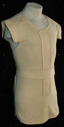 Description: A costume featured in Star Trek IV: The Voyage Home for wear by Leonard Nimoy in his portrayal of “Spock” during a scene in which he dove into a water tank at the Cetacean Institute in order to attempt a mindmeld with a pair of humpback whales. The costume is a cream colored set of shorts, a sleeveless top with a Velcro front seal, and a belt with a Velcro clasp. The costumer's tag reads ‘Star Trek IV, Leonard Nimoy as Spock, CHG#3, Sc#95-98’.