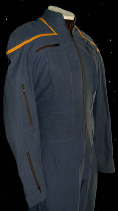 Description: A Starfleet uniform jumpsuit with command gold division strips around the shoulders made for Scott Bakula in his portrayal of “Captain Archer”. The costume is in almost perfect condition, made from fabric used during the first season of Star Trek: Enterprise. The uniform features multiple zippered pockets and Velcro size adjustments at the ankles and cuffs and comes with a black button front long sleeved undershirt. The sewn in Enterprise tag reads ‘Scott Bakula' while the costumer’s tags read ‘Archer, Scott Bakula, #A04, Starfleet Uniform, Not Finished’ and ‘Scott, Do not use this season, Needs to go to PCL’. Indeed, the usually buttoned down loops on the back of the waist are pinned to the costume instead of buttoned and white thread is present, the costume is also missing an “Enterprise NX-01” assignment patch, usually found on the left shoulder.