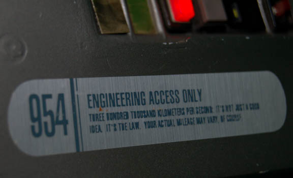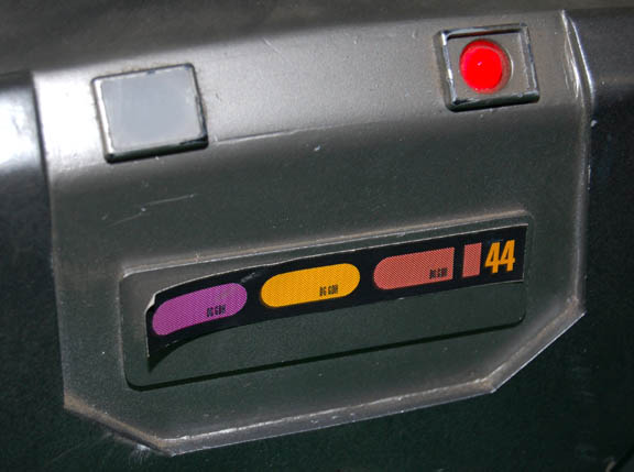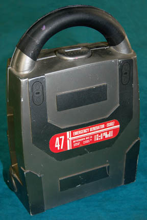 Description: A 24th century electronic prop “Emergency Generator” made for use during the filming of Star Trek episodic television. It is made of resin painted gun-metal gray with multiple Starfleet labels applied to its surface. The main label is titled “Emergency Generator – EG887”. There are multiple switches on each side however only one activates sequentially flashing red LED lights on each side and a static red light on the front. The case is taped shut. Due to time and use the paint is flaking off in places, most notably on the raised painted Starfleet emblem on the front. Measures approx. 10 ½ x 15 x 6 inches.