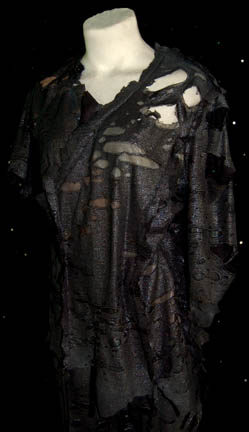 Description: A stunt costume featured in the Star Trek: Enterprise episode “Borderland”, “Cold Station 12”, and “The Augments” for wear by Chris Leps in his portrayal of “Malik”. The costume is a lot comprised of form fitting trousers, one set made from iridescent silver material and another of gold colored material, both featuring multiple tears and rips placed strategically, and an equally distressed pair of shirts, one silver and the other iridescent red. The two costumes come with a pair of tags reading ‘081-082 Stunt Malik, Chris Leps' and ‘081-082 Trey Murphey , ND augment’. A third costumer’s tag reads ‘Enterprise #80, 81, 82, ND + Stunt, Male Augments’.