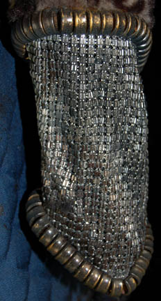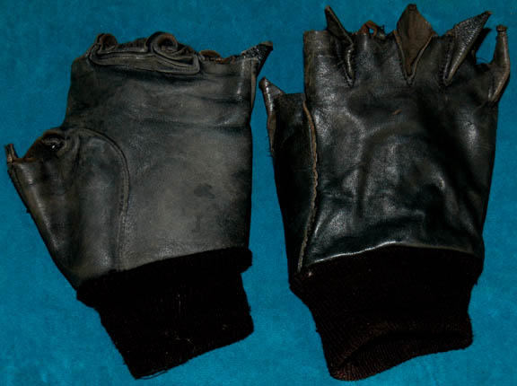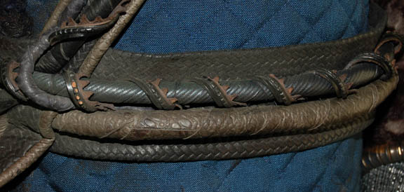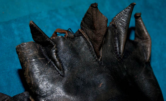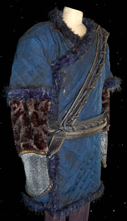 Description: A Klingon guard costume featured in the Star Trek: Enterprise episode “Judgment”. The costume is plum colored spandex trousers with Klingon trim style and a heavy duty quilted coat colored blue with fur trim and bunched fur sleeves that end in wide ‘chain mail'. The costume comes with a hefty belt harness that features molded rubber, and leather components, and a pair of leather fingerless gloves with claws. The sewn in Enterprise tag reads ‘Matt Papajohn #045’ and the costumer’s tag reads ‘Enterprise #045 “Judgment”, Stunt Klingon Guard A, Mike Papajohn’ and lists the components.