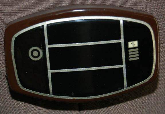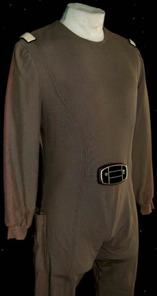 Description: An excellent representative of Starfleet uniform jumpsuits featured in Star Trek I: The Motion Picture. The item is a gray colored jumpsuit with affixed shoulder mounted white command division strips, and an affixed plastic bio-monitor at the belly. A slight degree of fading is evident on the sleeves and shoulders due to time and storage conditions. The costume is intended for male wearers.