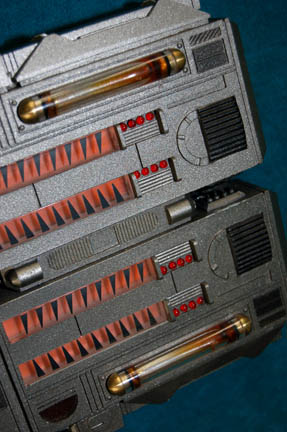 Description: A prop item featured in the Star Trek: Enterprise episode “Vanishing Point”; wherein “Ensign Sato” has her first transporter experience and thinks that something is happening to her molecules because of it. This item is part of a series of explosive devices that “Ensign Sato” imagined she saw aliens hooking up to vital systems on the “Enterprise NX-01”; it is a roughly rectangular device, resin cast in a pewter shade, bisected into two identical segments each with a black box at the top, twin clear segments featuring a red background and black triangular accents, two sets of four red LEDs, a tube with an orange colored fluid, a prop “dial” on the other end, faux “circuitry” with wires leading out of it and both pieces screwed together and tied with wire on the bottom. Item has untested electronics and measures approx. 6 X 6.5 X 2 inches.