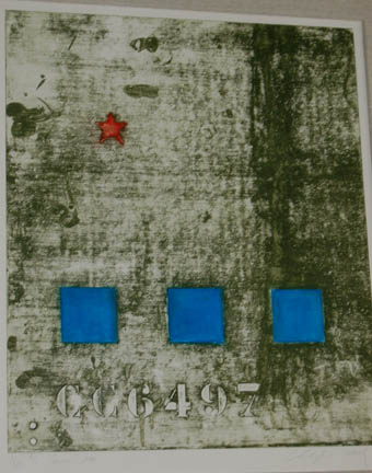 Description: A piece of set dressing from the quarters of the “Enterprise NX-01” Chief Medical Officer “Dr. Phlox” This item is a framed piece of art featuring a gray background and a painting of an abstract representation of various shapes in different colors and some numbers and letters; the frame is silver on the front and black elsewhere and has a wire for hanging on the back. The item measures approx. 30 X 25.5 X 1.5 inches.