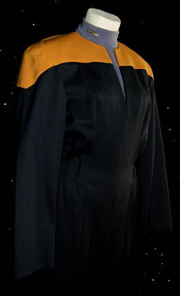 Description: A costume featured in various Star Trek: Voyager episodes for wear by Roxann Dawson in her portrayal of “B'Elanna Torres”. The costume is a black Starfleet uniform jumpsuit with operations gold shoulders and sewn in ‘away team’ gear loops on the form fitting waist. The costume also comes with a gray undershirt with snaps on the collar for the accompanying Maquis provisional rank pin made from silver colored metal with gold and black painted accents indicating the wearer to be a ‘lieutenant (junior grade). The components feature sewn in Voyager tags reading ‘Roxann Dawson’.