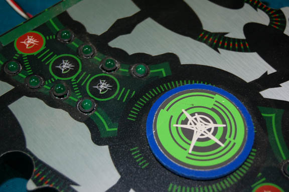 Description: A piece of set dressing featured in the Star Trek: Enterprise episode “Hatchery”; wherein the “Enterprise NX-01” comes upon a deserted Xindi-Insectoid ship with a hatchery full of eggs still inside and Captain Archer” (Scott Bakula) begins acting irrationally to try and keep them that way. This item is a trapezoidal circuit panel featuring one intact, screwed on hinge, silver and black two-tone color, a print of what could be described as a circuit path in black as well, green LED lights with Xindi script between them leading to a large, central, Xindi glyph; from the red glyphs on either side and the large one in the middle, the design would suggest this is some sort of systems maintenance panel to check on the conditions in the hatchery. The underside of the object has a print of a Xindi circuit board and features a similar graphic to the one on the front, further Xindi glyphs, untested electronics, and three wires that seem to be the power source for the LEDs leading out. The item measures approx. 8 X 9 X 1.5 inches not counting the length of the wire.