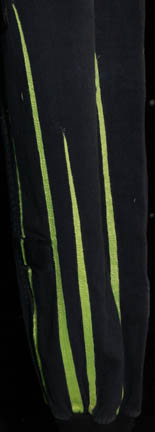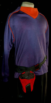 Description: A costume featured in Star Trek V: The Final Frontier for wear by William Shatner in his portrayal of “Captain Kirk” during his attempt to climb up ‘El Capitan'. The costume is a set of black trousers with multiple sewn in Velcro placements, and green accents extending up from the ankle cuffs, a purple iridescent sweatshirt with an orange neck accent and piping, a pair of ‘Borneal’ brand name blue rock climbing shoes with remaining dirt and plant matter from production use, a black nylon belt with a red chalk bag with remaining chalk the top of which has been taped closed with a black metal carabineer. The sweat shirt features a sewn in Paramount tag reading ‘Shatner’ and a stitched repair in the front and a small hole in the back.
