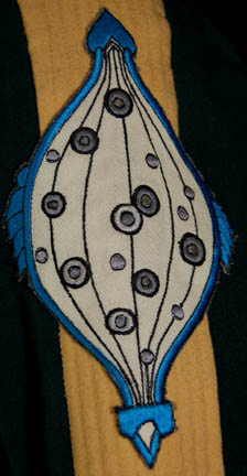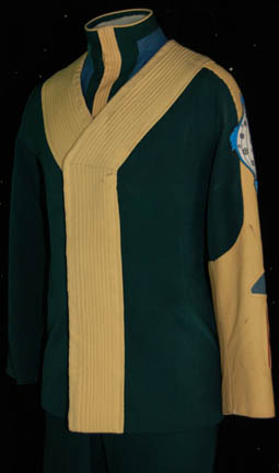 Description: A costume featured in Star Trek IV: The Voyage Home for wear by ushers in the Federation Security Council. The costume is green colored trousers with yellow accents at the bottom of the legs, a green long sleeved to with a yellow left sleeve and a band running around the collar and down the front Velcro seam. The yellow sleeve features a sewn on United Federation of Planets patch with a blue border depicting perhaps the flow of space around star systems, and a triangular inset of teal and an inset of red. The top features a left side pocket and snaps and clasps for the accompanying dickie colored green, yellow, and blue. The sewn in Western Costume Co. tag on the top reads ‘Diplomat' while the one in the trousers reads ‘usher’. Threads remain on the left sleeve blow the patch indicative of a removed item.