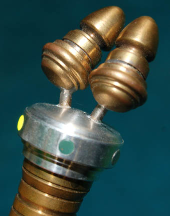Description: A prop medical device located on a sickbay tray in the Star Trek: Voyager episode “Imperfection” in which “Icheb” (Manu Intiraymi) saved “Seven of Nine's” (Jeri Ryan) life by donating his Borg node to her. The device is made of metal with two metal probes at the end. A small button on the side activates sequentially flashing green LED lights around the circumference. Measures approx. 5 x 1 ¼ inches diameter.