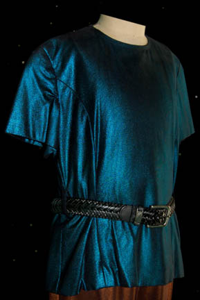 Description: A child's costume featured in the Star Trek: Enterprise episode “Cold Station 12” for wear by a child aged Augment. The costume is copper colored trousers and an iridescent blue colored short sleeved shirt with a woven leather belt. The sewn in Enterprise tag reads ‘Chandler Tayor’.