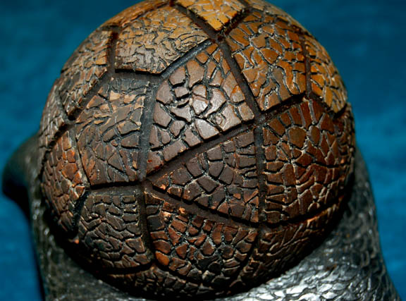 Description: A prop item featured in the Star Trek: Deep Space Nine episode “Dax”; wherein “Jadzia Dax” (Terry Farrell) is tried for a crime that “Curzon Dax” recently became the prime suspect for. This item is the gavel used in the proceedings to decide whether a Trill was responsible for the acts of previous hosts; it is a weighted sphere with the surface broken into roughly, equally-sized geometric shapes, in various shades of brown, but with each fragment broken into still smaller segments, and a gray, resin cast cradle with four legs and an identifiable scale pattern. The sphere's diameter is approx. 4 inches and the cradle measures approx. 5 X 4 X 2 inches.