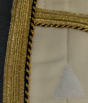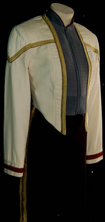 Description: A costume style first appearing in Star Trek IX: Insurrection, then again in Star Trek: Deep Space Nine, and later in Star Trek X: Nemesis. A Starfleet dress uniform, the item is a set of black trousers with gold trim down the outside seams of both legs bordering a command red division stripe and a white officer's jacket with white quilted shoulders and a gray quilted center zip seal, with gold trim bordering a red division strip on both cuffs. The costume features a sewn in tag reading ‘Eva Marie Knight’.
