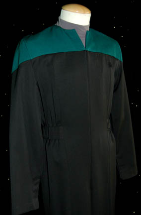 Description: A male Sciences Blue Starfleet uniform made for wear during the Star Trek: Voyager series. The uniform is black with Sciences blue shoulders, a small Velcro patch on the left breast for a Combadge (not included) to attach, a zip up the front and two pleats in the back. Around the waist are loops for away-team gear (not included) to attach. A gray long sleeved undershirt accompanies the jumpsuit. Costume comes complete with costume tag.