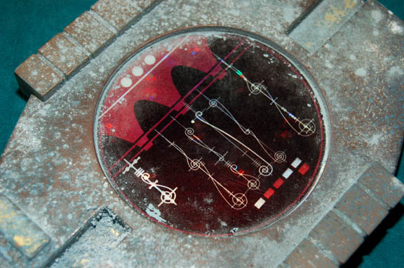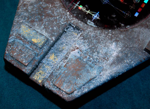 Description: A prop item similar to those featured in the Star Trek: Enterprise episode “Impulse”; wherein the “Enterprise NX-01” finds a seemingly derelict Vulcan ship floating in an asteroid belt of trillium fragments. This item is a P.A.D.D. (Personal Access Display Device) for portable transference and display of information; it resembles an elongated octagon in shape, is molded in brown plastic featuring textured, copper-colored accents, on the sides and bottom, a circular screen in the middle with a graphical application of some kind of waveform read out, and a heavy dusting of a bluish dust that is supposed to be “trellium dust”. The item measures approx. 7 X 5 X 0.5 inches.