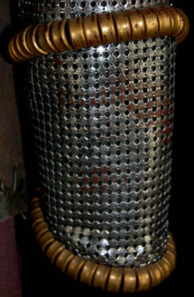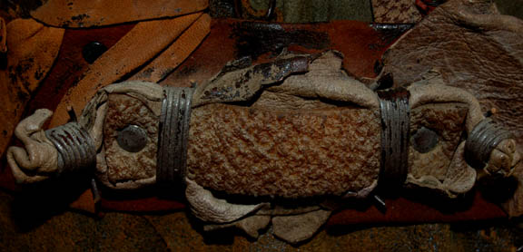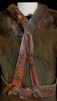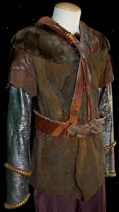 Description: The Klingons are a humanoid warrior civilization originally from the planet Qo'noS but now a strong and revered interstellar military power seen throughout the Star Trek anthology. This Klingon costume was made for wear during the Star Trek: Enterprise series. It includes a crudely stitched patchwork leather jacket with fur shoulders, chain-mail sleeves and a hidden zip up the front. The trousers are brown with pleats down the front, back and around the sides. The corresponding harness is made of pieces of leather bound and riveted together with snap fastenings. Costume comes complete with costume tag that reads “Enterprise – Klingon”.