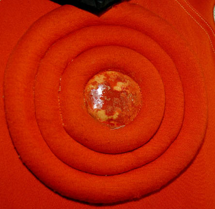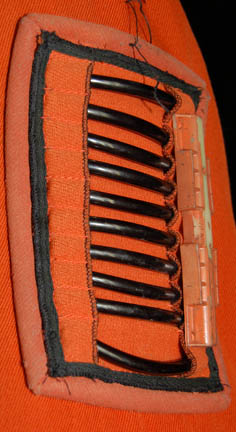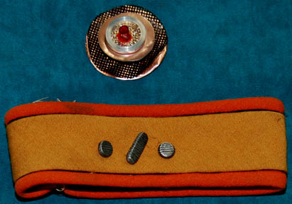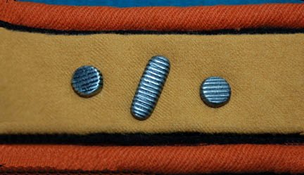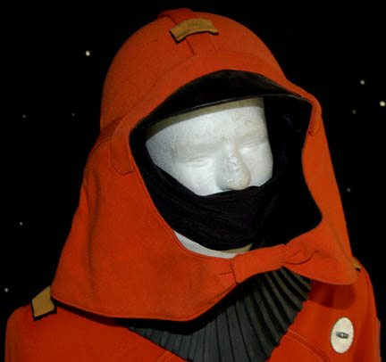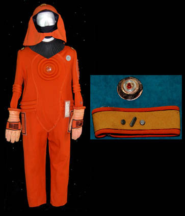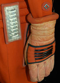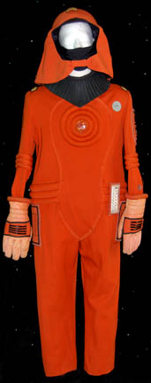Description: A stunt version orange Starfleet Engineer's radiological suit featured exclusively in Star Trek IV: The Voyage Home for wear by characters in Starfleet Command. The costume is an orange jumpsuit with an affixed metal breath mask connection on the left breast, a trio of affixed ‘thermal’ accents on the sleeves and thighs, an attached orange placement and an attached silver colored metal badge indicating the wearer to be the rank of ‘able-seaman’, an attached reflective silver waist accent, and these unattached elements: an orange trimmed yellow division strip with an affixed silver colored metal commendation bar and two similarly made ‘5 year service’ pins, and a center chest accent made from black and copper colored foil, a ribbed collar made from black foam rubber, a pair of gloves with black thermal tubing accents, a cloth covered helmet with a yellow division strip on the forehead, and a costumer’s tag reading ‘Window Crew, (Stunt), Star Fleet Command, sc. 49-54’.