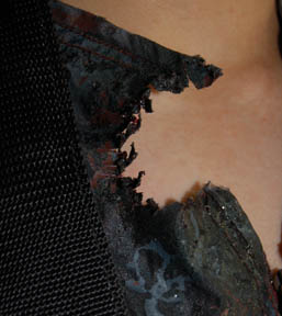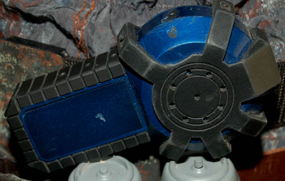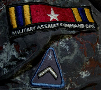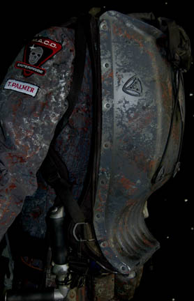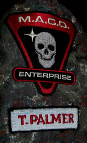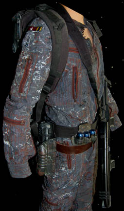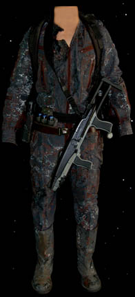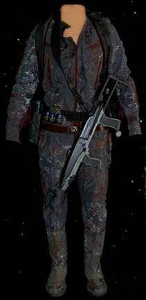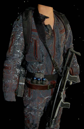 Description: A MACO (Military Assault Command Operations) uniform featured in various episodes of Star Trek: Enterprise in the third and fourth seasons. The uniform features a sewn on Terran Empire version MACO shoulder patch depicting a cracked skull and the word ‘Enterprise' indicating the wearer to be attached to the “ISS Enterprise NX-01” in the episodes “In a Mirror, Darkly: Parts I and II”. The costume is a set of gray trousers and a matching uniform jacket with multiple brown accents and zippered pockets, with size adjusting cuffs and matching size 11 boots with a brown tee-shirt that zips up the spine. The jacket features a ‘scorch’ hole on the right collar with melting occurring across the right breast pocket zipper. The costume lot comes complete with a belt featuring multiple holsters for accompanying items including a trio of ‘gun clips’, a pair of ‘grenades’, one molded rubber and the other similar but with an untested ‘grenade’ (untested in that it has not been opened for the sake of changing the power source, in fact, none of them have been opened by our staff in an effort to retain their original craftsmanship), a hand scanner, a ‘stun baton’, a prop soft foam rubber EM-33 hand pistol and a sturdy vacuum formed holster. The costume features a painted to match shell backpack with a label inscribed ‘Dom’, and a sturdy, high quality molded rubber MACO energy carbine with a black nylon shoulder strap. The uniform features a MACO division patch and rank patch on the right sleeve indicating the wearer to be a ‘private’, the left sleeve features the “ISS Enterprise NX-01” MACO assignment patch and a name strip reading ‘T. Palmer’. Sewn in Enterprise tags indicate wear by various actors. 5047