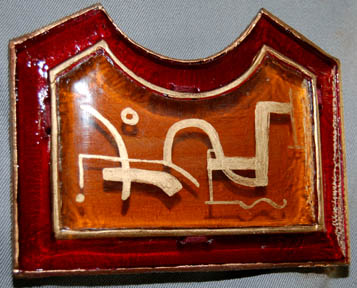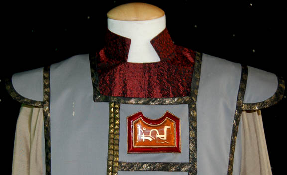 Description: A costume featured in Star Trek VI: The Undiscovered Country for wear by Vulcan Khitomer Attendees. The costume is trousers with a top with matching sleeves. The top features a red iridescent flower patterned chest and is worn under a gray tabard with gold patterned trim lines and a Vulcan badge centered on the chest.