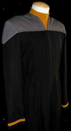 Description: A costume featured in the tenth Star Trek feature film, “Nemesis”; wherein a political coup takes place in the Romulan Empire and the crew of the “Enterprise-E” travel into its heart and “Captain Picard” (Patrick Stewart) finds a familiar face planning the destruction of Earth. This costume is for wear by the stunt double of Brent Spiner in the role of the only android in Starfleet, “Commander Data”, and is referred to as the “First Contact-style” Starfleet uniform because it was first used in the feature film of the same name and went on to be the standard; it consists of a long-sleeved, full-length, black jumpsuit featuring blue-gray, quilted shoulders, a Velcro patch for a commbadge (not included), Operations Gold strips around the cuffs, hoops around the waist for tools, stirrups for the feet and a long-sleeved undershirt also in Operations Gold with a zip up the back. A sewn in tag reads '11-01, Brian Williams, Stunt Data’.