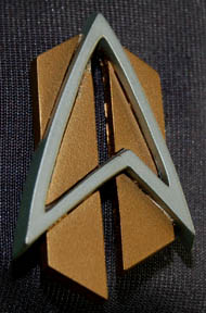 Description: A gray future Starfleet cadet uniform featured in the Star Trek: Voyager episode “Endgame”. The costume is a gray jumpsuit with a double breasted appearance and features an accompanying resin future Starfleet combadge for attachment to the Velcro placements on the left breast. The costume is intended for male wearers.