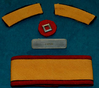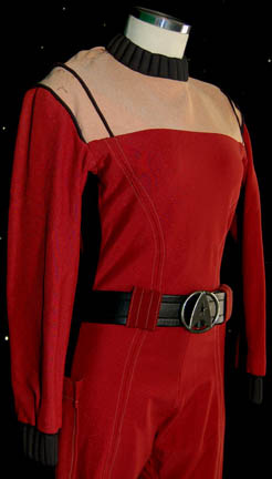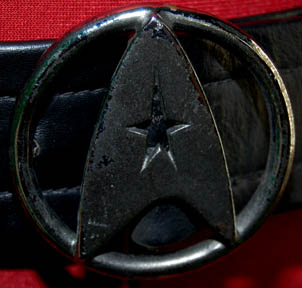 Description: A Starfleet crewman's uniform appearing in Star Trek feature films starting with Star Trek II: The Wrath of Khan. The costume is a red jumpsuit with a tan chest and back, has multiple lines of piping, and a ribbed collar and cuffs colored black indicating the wearer to be a crewman (as opposed to a trainee). The uniform is accompanied by these unattached elements: a full six silver colored name badges inscribed with the name ‘DAX’ etched into them, a red trimmed yellow division strip for the left sleeve forearm, a pair of yellow division strips for the shoulders, a red placement with a silver colored metal badge affixed to it indicating the wearer to be an ‘able-seaman’ (no referenced to the character of “Dax” indicate his rank in the movie), and a bronze colored wire backed metal Starfleet emblem for the left breast. The character of “Dax” was portrayed by Michael Snyder in Star Trek VI: The Undiscovered Country, he was the patsy into whose locker was planted the gravity boots used during the assassination on the Klingon flagship. The costume was located separately of the elements which were located together with a tag reading ‘Michael Snyder as DAX S.T. VI’. The Starfleet badge was located separately of the costume as was the black leather belt with the silver colored metal Starfleet emblem buckle which is inscribed ‘Louis Ortiz’.