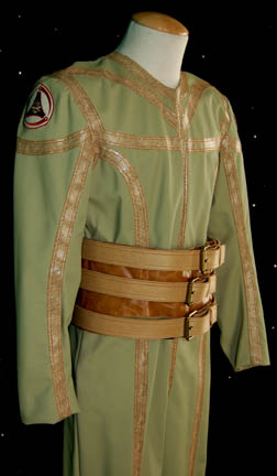 Description: A costume featured in the Star Trek: Enterprise episode “The Shipment”; wherein the “Enterprise NX-01” comes upon a Xindi mining outpost where a substance being used in the Xindi Super weapon is being produced. This costume is for wear by Jack Alsted in the role of one of the Xindi-Arboreal working under “Gralik” (John Cothran Jr.) at the kemocite mining facility and refinery; it is a long-sleeved, full-length jumpsuit in a very light green, vinyl fabric featuring brown, stitched accents with a faux scale pattern all along the garment, a Xindi patch on the both shoulders, Velcro patches for a wide, brown belt with three smaller, lighter brown belts Velcro'd to it. A sewn in tag reads ‘Enterprise, Jack Alsted’ and the costumer’s tag reads ‘#59 Enterprise The Shipment, Sloth #2, Jack Alsted’.
