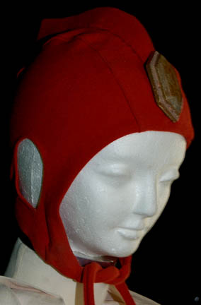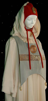 Description: An off white colored robe with a tabard and a red skull cap featured presumably in Star Trek III: The Search for Spockā. The robe sleeves are pleated to appear ribbed and the tabard is blue-gray with white tassels wrapped in a spiral of gold accent. The skull cap features and affixed Vulcan badge with iconographic lettering painted on.