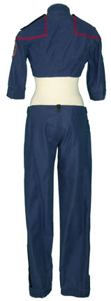 Description: The “evil Mirror Universe” of Star Trek is a place where our heroes are duplicated though their personalities are vastly different due to their changed circumstances. The Federation has been replaced by a Terran Empire that rules by force and conquest instead of governing by diplomacy and democracy. Changes in the chain of command frequently come through assassination, mutiny, and seduction. Costumes like this one were featured in the two episode story arc “In a Mirror, Darkly, Parts I and II” of Star Trek: Enterprise. This item consists of a Terran Empire Starfleet uniform including the notorious ‘Enterprise NX-01' left shoulder patch, a patch emblem of the Terran Empire on the opposing right shoulder, red engineering division trim around the shoulders, and black epaulettes for rank. This female version of the Terran Empire Starfleet uniform is made up of two pieces, a crop top with short sleeves and low cut pants with calf length legs. “Star Trek: Enterprise” uniforms feature multiple zippered pockets and Velcro size adjustments in the legs and cuffs. The Enterprise tag sewn inside the costume indicates use in the episodes “In a Mirror, Darkly, Parts I and II” by various actresses.