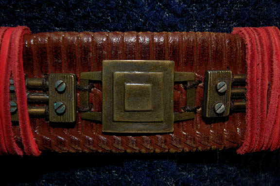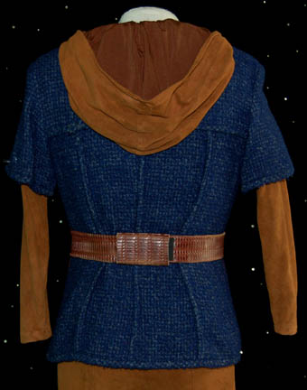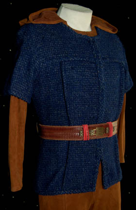 Description: A costume featured in the Star Trek: Enterprise episode “Detained” for wear by “Lt. Reed” (Dominic Keating) while masquerading as a Suliban prisoner in a Tandaran concentration camp. The costume is a brown suede jumpsuit with two dark blue knit tops and a brown leather belt with a keep. The items feature sewn in Enterprise tags reading ‘Dominic Keating #021' and the costumer’s tag reads ‘Enterprise ep. #021 “Detained” Reed as Suliban, Dominic Keating’.