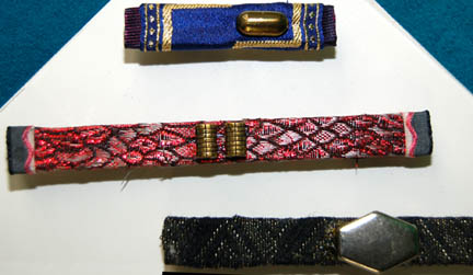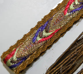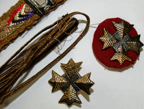 Description: A flag admiral's rank badges, strip, and campaign ribbons featured on a rear admiral in the Starfleet Headquarters sequence in Star Trek VI: The Undiscovered Country. The badges are silver and gold colored metal, one is affixed to a red placement for the left costume forearm sleeve, antique multi-colored ribbon and gold lace with a single fabric swath to further indicate rank is worn on the same sleeve, and a trio of variously sized campaign ribbons are present, multi-colored with various metal embellishments. A gold colored string is accompanying for attachment to the front of the uniform jacket.