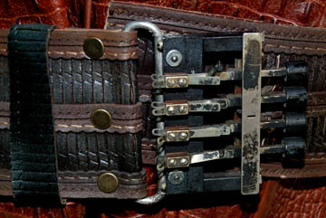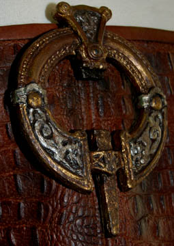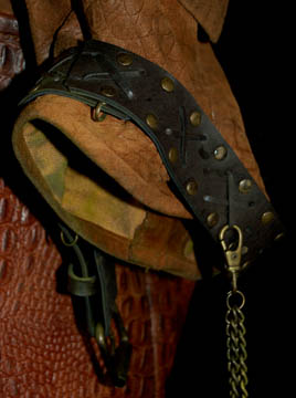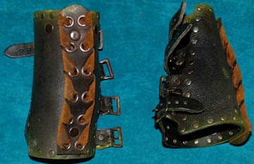 Description: The Orions are a humanoid species with distinct green skin from the Orion planet. This elaborate uniform was worn by an Orion guard in the Star Trek: Enterprise episode “Borderland”. It features incredible leather trousers with a built in codpiece. There is a zip up the back and stirrups at the feet. The body piece is made of reptilian print leather with lacing up the back, buckles around the cuffs, layered leather covered shoulder armor, chains and a painted resin emblem attached on the front. Also included is a lattice and stitched pattern belt with a detailed metal buckle and two corresponding leather wrist gauntlets. Costume comes complete with costume tag that reads “Enterprise #80 Borderland – Orion Guard”.