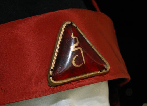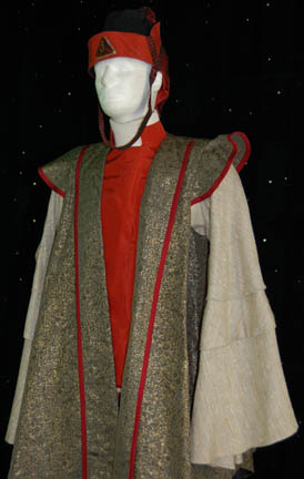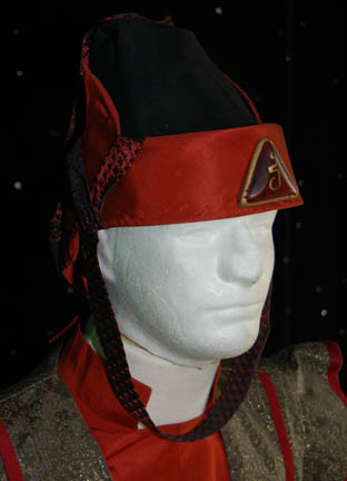 Description: The Vulcans are a humanoid race from the plant Vulcan who are known for their great sense of logic and stoic nature. They were one of the instrumental species responsible for establishing the United Federation of Planets. This is a set of Vulcan robes made for the filming of the first Star Trek feature films. The shirt has a rust color front section and high collar with cream layered bell shaped sleeves. The trousers match the sleeves and have a drawstring waist. Worn over the top is a patterned vest with crimson trim and cuffed shoulders. The costume comes complete with a black felt Vulcan hat with orange and crimson trim and a resin decorative accent in the center.