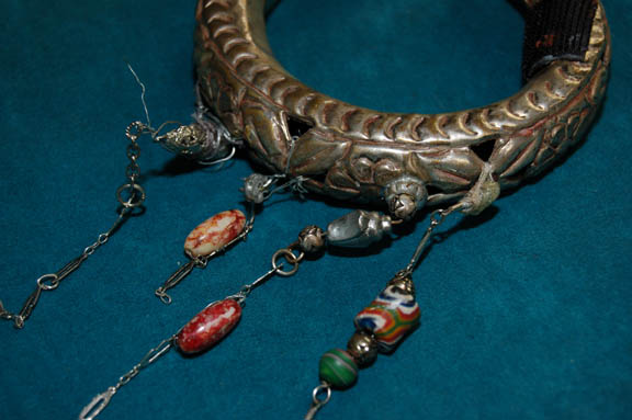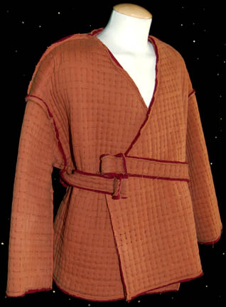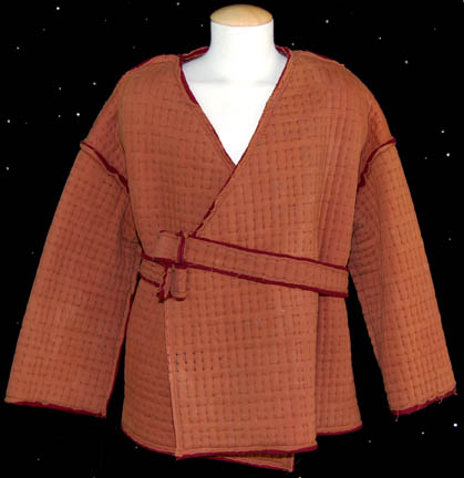 Description: A costume featured in the Star Trek: Deep Space Nine episode “The Reckoning”; wherein the discovery of the 20,000 year old Bajoran city of B'hala yields the discovery of an even older tablet that reads of “The Reckoning”, a duel between a pah-wraith and one of the prophets. This costume is for wear by James Greene in the role of “Koral”, the Bajoran Ranjen who leads “Captain Sisko” (Avery Brooks) through the excavations of the ancient city; it consists of a large, rust-colored, quilted, coat in a stitched pattern of open rectangles, rough hems with burgundy accents, wrap around front with buttons down the inside, matching sash, and metal belt latch with little “jewels” hanging from it akin to what would be on a Bajoran’s earring. A sewn in tag reads ‘Deep Space Nine, Jimmy Greene’ and the costumer’s tag reads ‘DS9 545, Koral, James Greene’.