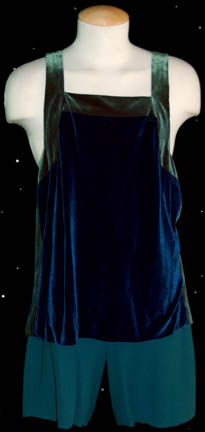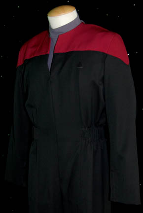 Description: A lot of costumes featured in various Star Trek: Voyager episodes for wear by Robert Duncan McNeil in his role as “Tom Paris”. The first is a Starfleet uniform jumpsuit colored black with command red shoulders with a gray padded undershirt for extra musculature. The sewn in Voyager tag reads ‘Rob McNeil Good #4 1-22-99'. Another costume is dark blue trousers with a long sleeved iridescent black and blue patterned shirt, both garments feature sewn in tags, the costume comes with a wide textured rubber belt with a label. Also present, a green velvet jumpsuit with a texture patterned top, and a pair of green trunks with a blue and green velour tank. All of the tops feature sewn on combadge placements. The items feature sewn in Voyager tags indicating purpose for Robert McNeil in various incarnations of spelling and come with costumer’s tags.