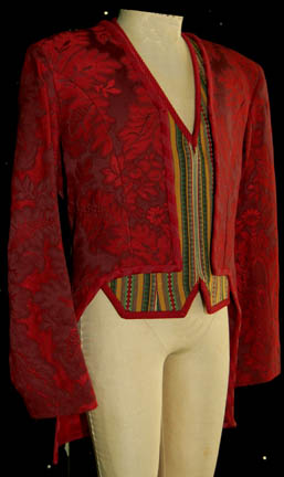 Description: A lot of two children's costumes made for wear in “Captain Picard’s” (Patrick Stewart) Christmas fantasy scene in Star Trek VII: Generations. The first is a male boy costume that includes a blue wool jumpsuit with white cuffs and collar, a multicolored square patterned waistcoat and a green patterned jacket with brown and green trim. The second is also a male boy costume and includes a multicolored striped waistcoat and a crimson patterned coat. Costumes come complete with costume tags that each read “ST VII “Generations” Child in Picard’s Xmas fantasy”.