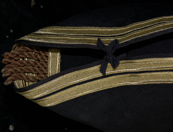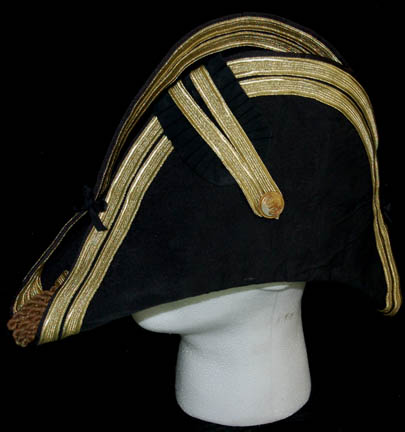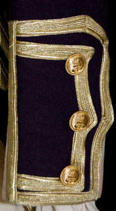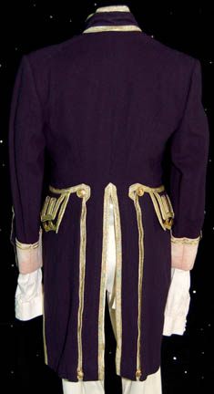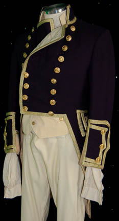 Description: A stunt costume featured in Star Trek VII: Generations for wear by “Dr. Crusher” during scenes taking place in the holodeck of the “Enterprise-D” on a sail boat during a promotion ceremony. The costume is an 18th century sailing British sailing uniform comprised of breeches, a white long sleeved shirt, a white vest with gold colored buttons, a dark blue wool jacket, and a blue officer's hat with gold colored trim. The costumer’s tag reads ‘Star Trek VII Pat + Suzanne, Beverly stunt 39-49’. A degree of staining on the white portions of the jacket indicate likely liquid damage.