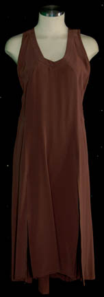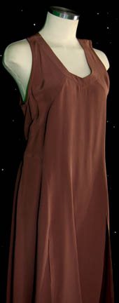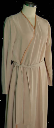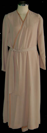Description: A costume featured in various episodes of Star Trek: Voyager for wear by Kate Mulgrew in her portrayal of “Captain Janeway”. The costume is an off white colored robe and a plum colored apron with snaps and clasp enclosures. Both garments feature sewn in Voyager tags reading ‘Kate Mulgrew' and the costumer’s tag is relevant to the robe. The items were located in the Kate Mulgrew collection.